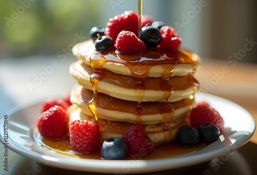 Fluffy Pancakes Drizzled with Syrup on a Sunny Morning