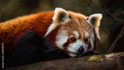 Fluffy panda sitting on tree branch outdoors generated by AI