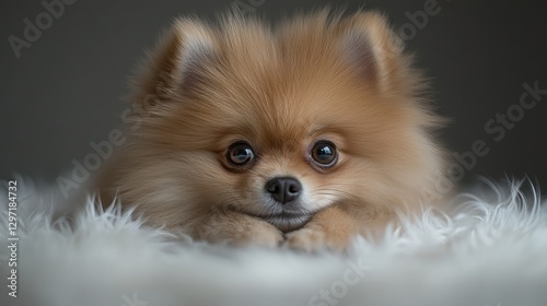 Fluffy Pomeranian puppy resting on white fur rug, studio shot