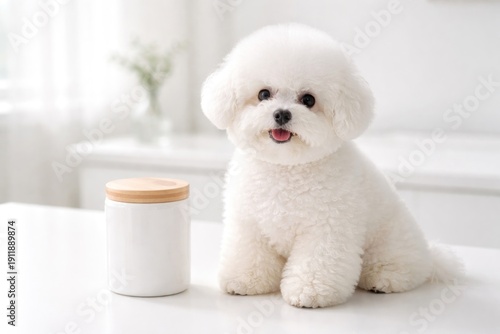 relaxation, adorable, daylight, domestic, lighting, portrait, tabletop, ceramic, sitting, animal, beside, bichon, bright, fluffy, gentle, modern, clean, photo, plain, puppy, small, table, white, cute, near, text, tone, dog, jar, lid, pet