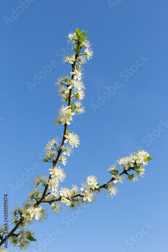 Fluffy, snow-white plum branch with young green leaves against the blue cloudless sky. White plum blossoms. Stormy spring bloom. Sunny morning.