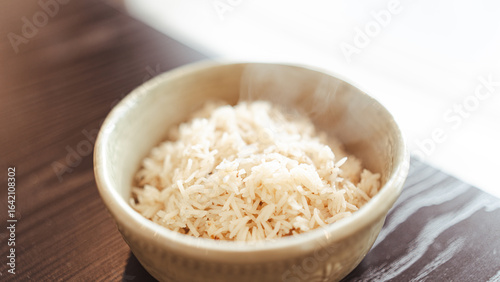 Fluffy white basmati rice steaming fresh from the pot. Perfectly cooked grains for food photography, recipe blogs, and Asian/Indian cuisine content