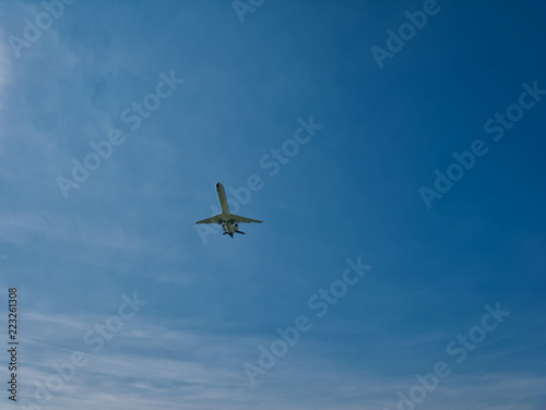 Flugzeug in der Luft bei blauem Himmel mit wolken
