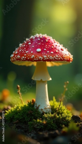 Fly agaric's white spots glisten with dew and sunlight, forest, nature