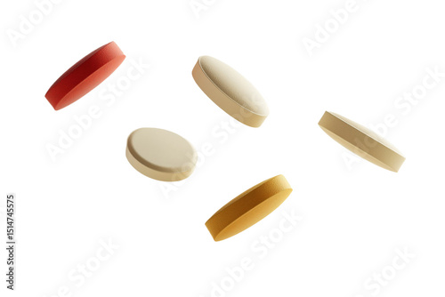 flying drug tablets in different orientations representing pharmaceutical diversity isolated on white