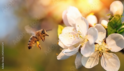 Flying Honey Bee Collecting Pollen from Tree Blossom on a Sunlit Morning, Capturing the Vitality of Natures Symphony in Early Spring