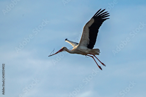 Flying stork with a twig for nest building. White stork (Ciconia ciconia).