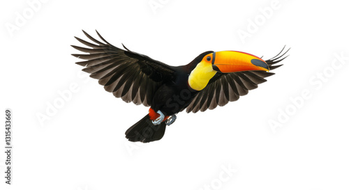 flying toucan bird isolated on transparent background, PNG, toucan flying cutout, flying bird png, tropical bird flying, toucan isolated png, flying tropical bird