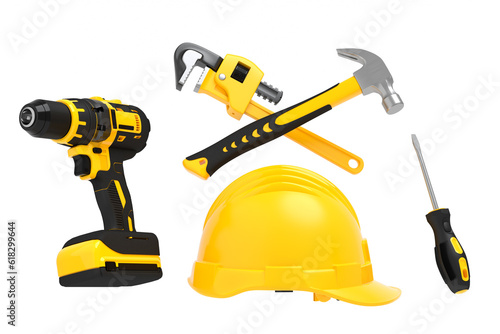 Flying view of yelllow construction tools for repair on white background