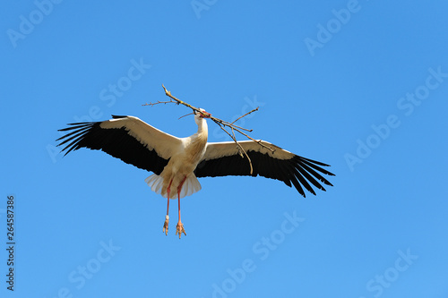 white stork, stork, flying, flight, nest, material, single, 1, bird, european, europa, german, nature, wildlife, animal, fauna, horizontal, bill, wing, blue skies, beak, feather