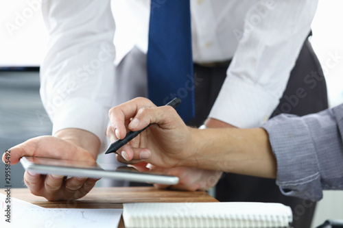 Focus on colleagues hands holding modern tablet and stylos. Businessmen discussion new biz project. Designers creating start-up. Creative work concept. Blurred background