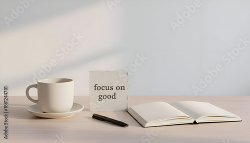 Focus on good message printed on card in minimal desk scene with warm daylight