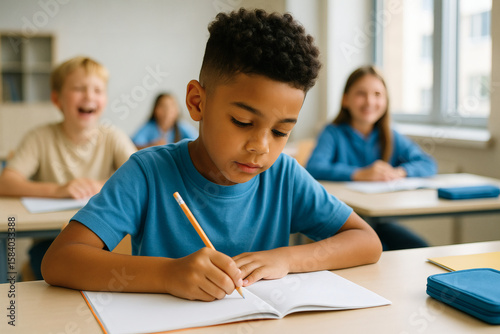 Focused African American Boy Writing in Classroom
