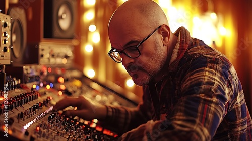 man, studio, music, audio, mixing, engineer, producer, recording, technology, sound, console, control, panel, equipment, professional, musician, artist, goggles, bald, focused, concentrated, working, desk, light, interior, room, design, workplace, job, occupation, person, male, adult, face, expression, serious, intense, creativity, innovation, process, industry, entertainment, digital, buttons, knob, dial, warm