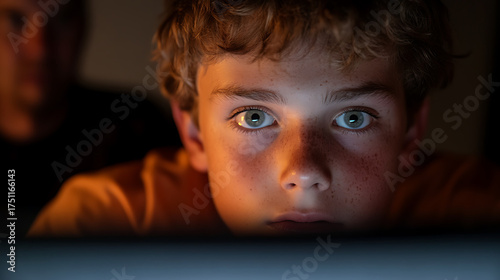 children, screen, dark, light, face, boy, sharpened, eye, illumination, technology, computer, cyberspace, gaming, online, digital, youth, young, indoor, portrait, night, teenage, watching, staring, closeup, concentration, intense, interest, entertainment, education, learning, modern, home, family, activity, lifestyle, human, person, looking, reading, content, display, bright, glow, isolated