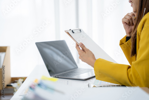 Focused Business Woman: A businesswoman in yellow jacket, engrossed in a thoughtful contemplation, meticulously examines a clipboard in an office environment, capturing a moment of focused diligence.