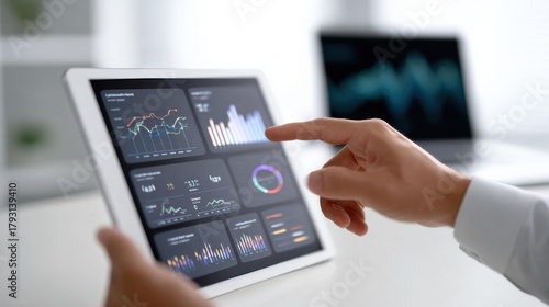 businessman, office, hand, gesticulate, tablet, screen, analysis, financial, datum, chart, graph, business, intelligence, focused, concentrated, technology, digital, laptop, desk, touching, finger, dashboard, interface, report, statistic, information, marketing, investment, growth, strategy, planning, working, professional, man, adult, male, person, corporate, management, software, application, modern, workspace, indoor, stock, market, interactive, progress