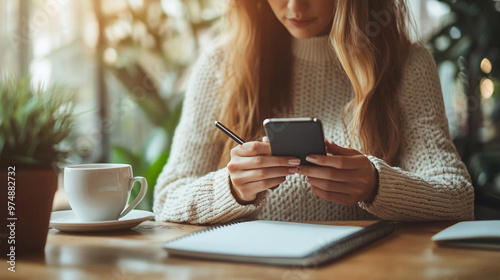 focused businesswoman takes notes while holding a tablet, reflecting productivity, organization, and multitasking. The image symbolizes diligence, professionalism, and technological integration