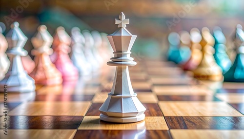 Focused chess king amidst a blurred array of other game pieces on a checkered board