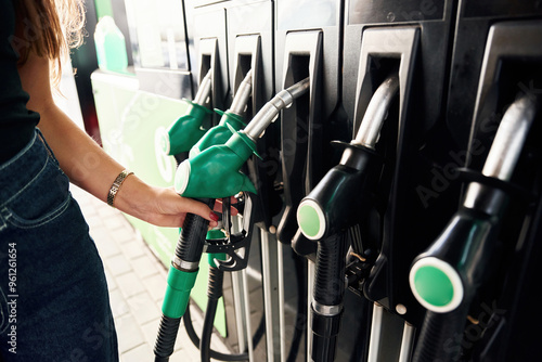 young, woman, gas, station, green, colours, device, holding, hand, close, up, view, detailed, ready, use, standing, casual attire, clothes, wear, fuel, gasoline, pump, background, technology, concept, white, oil, offer, urban, service, diesel, transport, ownership, driver, female, lady, refilling, ethnicity, 1, person, day, outdoors, outside, client, business, adult, modern, break, jean