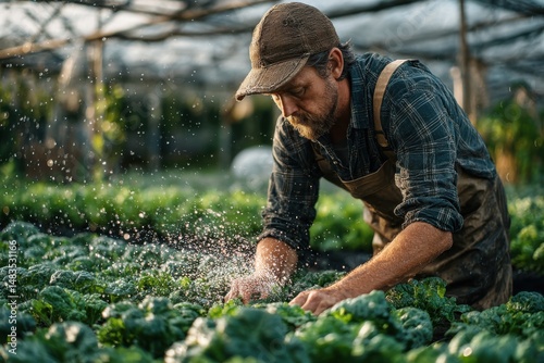 farmer, lettuce, germ bud, greenhouse, agriculture, food, cultivation, crop, hydratation, growth, plant, farming, vegetable, produce, irrigation, organic, sunlight, nourishment, harvest, gardening, care, water, labor, man, beard, plaid, shirt, hat, healthy, nourishment, leaf, field, dirtied, working, sustainable, outdoors, agronomy, lifestyle