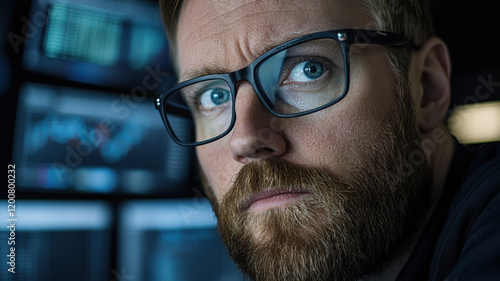 technology, stock exchange, graph, professional, serious, male, goggles, beard, workspace, business, finance, investment, corporate, concentration, digital