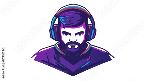gamer, avatar, profile, head shot, man, earphones, digital, illustration, style, design, modern, graphic, professional, serious, intense, focused, concentration, technology, online, virtual, video, game, entertainment, passionate, cool, hip, character, icon, logotype, creative, colourful, abstract, digital artwork, portrait, bearded, male, electronic, headset, listening, seriousness, graphic, identity