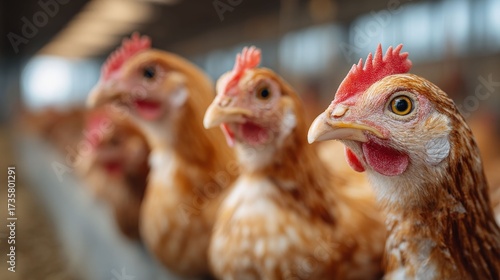 Focused Hen Portraits: A row of healthy hens are showcased up close in a high-angle shot, exhibiting their natural posture and features.