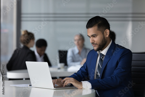Focused Indian employee man working on online project at laptop, typing, chatting, sitting at workplace table in open office with business meeting of diverse colleagues in background