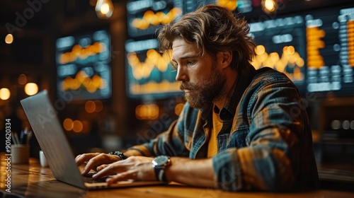 coffee, evening, laptop, focused, datum, casual attire, bearded man, productivity, cafes, technology, concentration, business, urban setting, statistic, investment, networking, entrepreneur, hot drink, self employed, freelance, commitment, determination, generative, ai