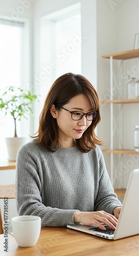 Focused Japanese Freelancer in Her 20s or 30s with Elegant Brown Shoulder-Length Hair Typing on a Laptop at Home