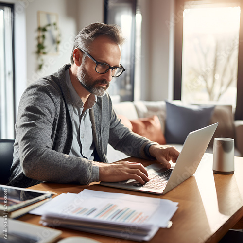 Focused Male Adviser Working with Financial Reports and Laptop at a Home Office Desk, Generative AI