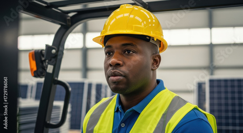 Focused male construction worker in safety vest and yellow hard hat operating machinery in modern warehouse facility, displaying professionalism and concentration