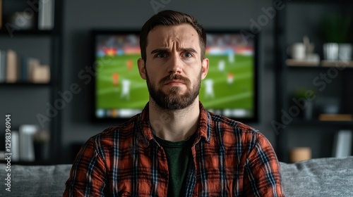man, sport, game, television, modern, room, indoor, serious, concentration, expression, background, furniture, couch, casual attire, home, leisure, audience, entertainment, lifestyle, masculine, technology, energy, engagement, visual, athletic, competition, hobby, viewing, sitting, enjoyment, spectator, atmosphere, mood, distraction, observation, interest, screen, emotional, casual clothes, carpet, home decor, digital, activity, thrilling, sharpened