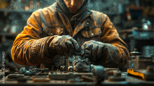 mechanic, glove, repairing, workshop, focused, protective, work, industrial, labor, technician, manual, craft, tool, machinery, engineering, hand, concentration, skilled, profession, metal, gear, equipment, service, expertise, trade, fabrication, workbench, safety, occupation, craftsmanship, mechanical, precision