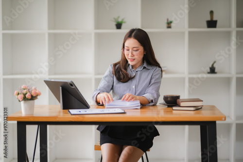 Focused Professional: A young businesswoman meticulously reviews documents at her desk, showcasing dedication and focus in a modern office setting. The image exudes efficiency and professionalism.