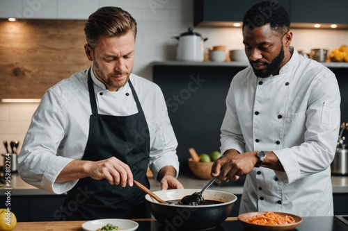 focused, professional, chef, wiping, plate, working, pouring, sauce, cooking, teamwork, collaboration, diverse, kitchen utensile, culinary, industry, hospitality, preparation, african american, male, eatery, apron, stove, multitask, team, caucasian, man, tidying up, kitchen equipment, uniform, diversity, food industry