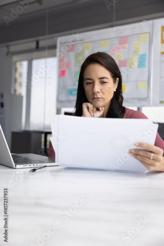 Focused report review. Serious young businesswoman manager executive reading paper documents with thoughtful expression at workplace analyze financial information ponder business decision. Copy space