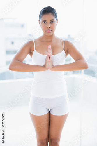 window, bright, brunette, brown hair, pretty, attractive, active, fit, toned, healthy, fitness, health, physical, shape, activewear, sporty, top, white, exercise, standing, athletic, slim, slender, body, beautiful, wellness, bodycare, serious, stern, unsmiling, peaceful, portrait, yoga, balance, zen, meditation, meditating, leisure, lifestyle, well-being