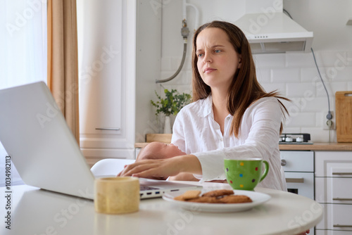 woman, baby, remote, business, computer, newborn, children, cyberspace, kitchen, technology, focused, concentrated, tying, family, mother, work, laptop, online, home, eltern, son, girl, children, care, working, daughter, infant, job, boy, children