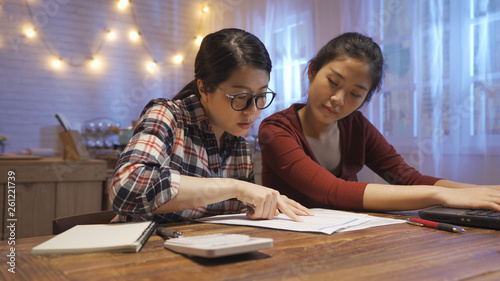 Focused young asian girl roommates checking analyzing utilities bills sitting together at kitchen wooden table. serious women reading bank loan documents financial planning expenses using laptop.