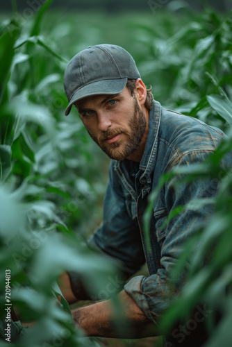 Focused young farmer evaluating cornfield at dusk, representing agriculture industry, healthy eating, and marketing with clear copy space for text.