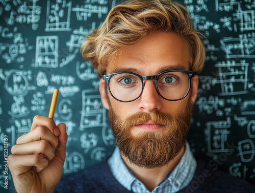 man, goggles, beard, blackboard, thinking, crayons, intellectual, mathematic, serious, teacher, sharpened, blackboard, learning, problem solving, academic, student, cognition, education, studying, writing, classroom, intelligent, prof, scientific, teaching, blond, young men, thoughtful, calculation, school, curly hair, analysis, scholar, deep thought, innovation, inspiration, research