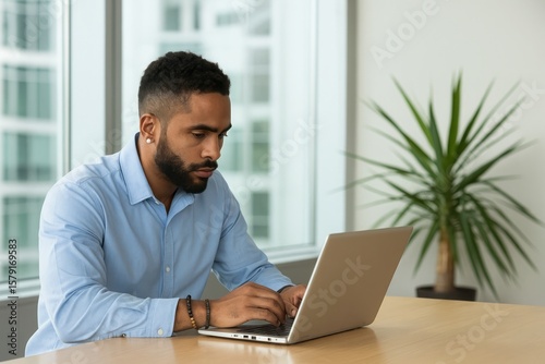 man, laptop, office, desk, professional, working, indoor, plant, modern, natural light, window, building, focused, concentration, technology, corporate, business, male, workspace, beard, coiffure, jewellery, accessory, table, interior, design, contemporary, serious, computer, typing, hand, digital, communication, cyberspace, connection, online, freelance, lifestyle, education, learning, studying, success, innovation, growth