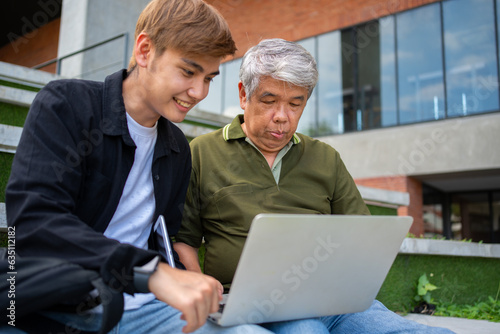 Focused young students listening old senior aged teachers for advise capstone project in university. Happy middle aged teacher working together with students for graduation project.