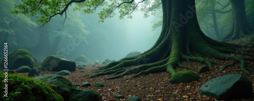 Foggy forest glade reveals ancient tree roots among rocks, tree, nature