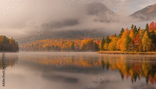 Foggy lake surrounded by autumn leaves and mountain reflections