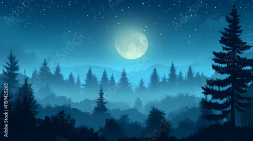 Foggy moonlit morning in dark woods. Moonlit. Illustration