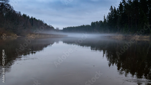 Foggy Morning Over a Calm River with Reflections of Trees - Tranquil Wilderness Scene