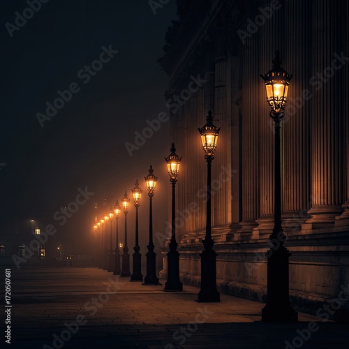 fog, night, lamp, street, building, ancient, column, stone, warm, light, glow, dark, misty, pathway, urban, architecture, historical, europa, exterior, vintage, illuminated, ambience, mood, serene, peaceful, quiet, lonely, dramatic, silhouette, light, gold, glowing, long, perspective, even, row, line, calm, mystery, darkened, hazy, soft, softly, lit